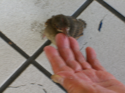 どうやら巣から落ちたようです。そういえば、おいらたちすれすれに鳥が飛び交っています。親でしょうか。